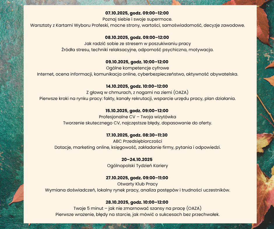 Zajęcia skierowane są do wszystkich osób poszukujących pracy – zarówno tych, które szukają zatrudnienia po raz pierwszy, wracają na rynek pracy po przerwie, jak i tych, którzy chcą zmienić ścieżkę zawodową lub znaleźć nowe możliwości rozwoju.